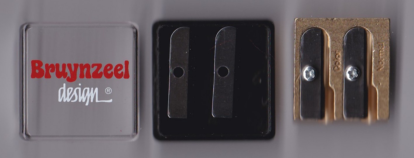 Een vlijmscherpe puntenslijper van Bruynzeel met 2 reserve mesjes.